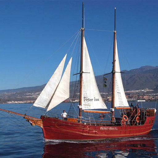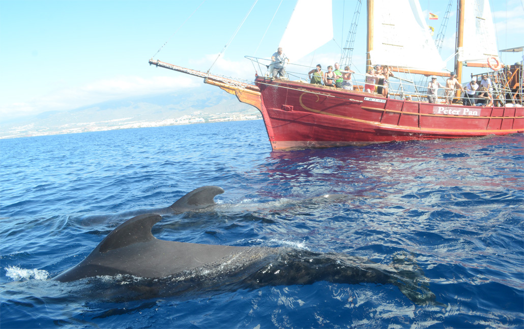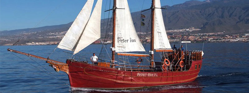 El barco PETER PAN tiene su base en el Puerto de Los Cristianos, desde donde iremos a visitar la colonia de ballenas pilotos y delfines mulares.